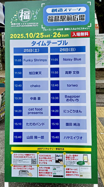 演奏時間が近づいて来たので、雨があがっている事を期待して東口駅前広場へ行ったのだが、なにやら霧雨な雨が降っていて、そんな中聞いていただいた方々、「ふくしままちなか音楽祭」の関係の方々、ありがとうございました。