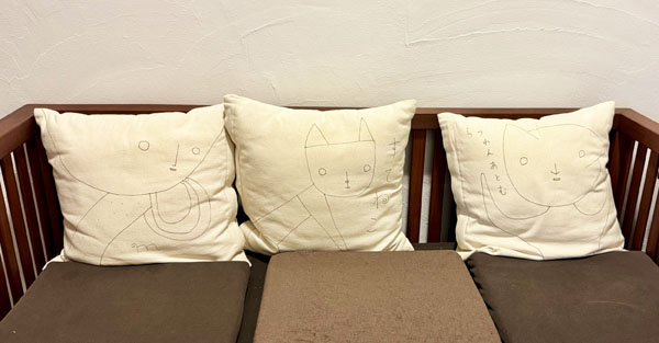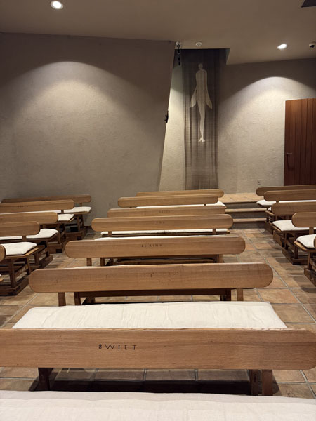 客席は教会の椅子を思い起こさせる長椅子・・背もたれにはそれぞれ違う単語が入れられています